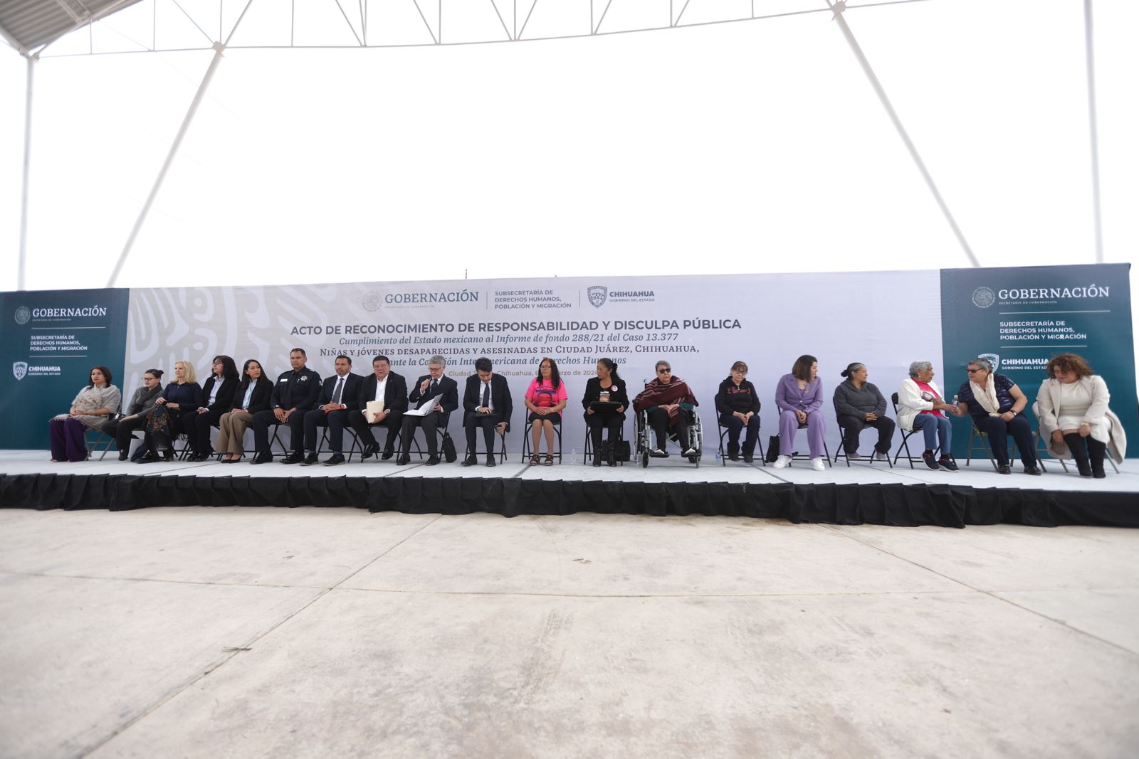 El acto protocolario, celebrado en el Memorial del Campo Algodonero, fue encabezado por Félix Arturo Medina Padilla, subsecretario de Derechos Humanos, Población y Migración, de la Secretaría de Gobernación y Joel Hernández García, subsecretario de Asuntos Multilaterales y de Derechos Humanos de la Secretaría de Relaciones Exteriores.