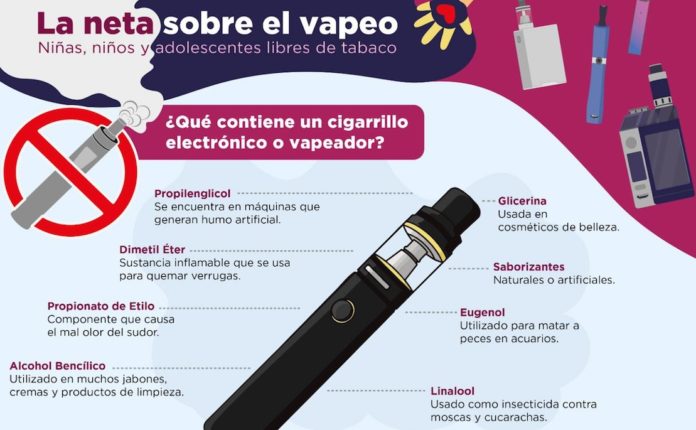 El SIPINNA señaló que el vapeador contiene propilenglicol que se encuentra en las máquinas que generan humo artificial, además dimetil éter, cuya sustancia inflamable se usa para quemar verrugas.