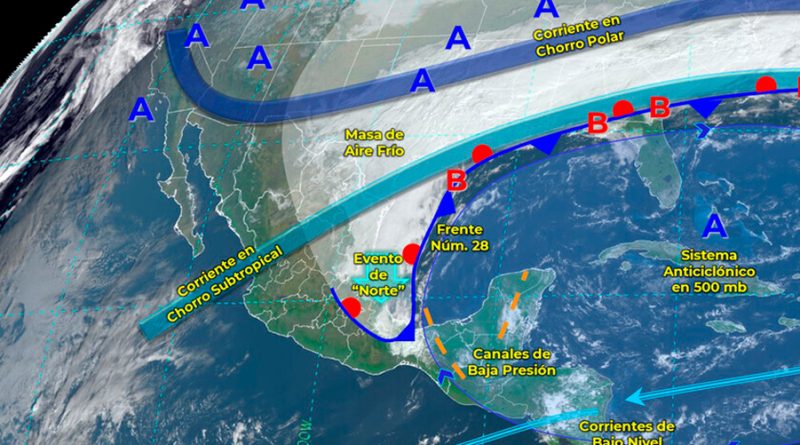 Para este miércoles, la aproximación de un frente frío (número 40) al norte del país asociado a una vaguada polar y la corriente en chorro polar en interacción con un canal de baja presión y una línea seca sobre Coahuila, favorecerán ambiente de frío a fresco por la mañana, de cálido a caluroso por la tarde, temperaturas muy frías con algunas heladas en la zona serrana, cielo de despejado a mayormente despejado.