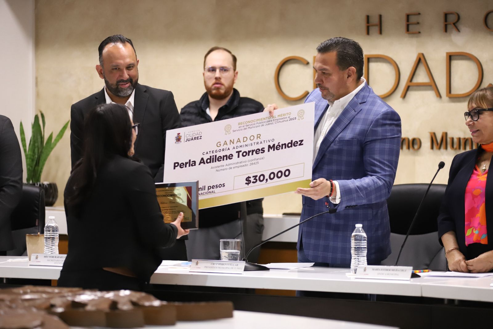 Tres trabajadores de diferentes dependencias recibieron en sesión extraordinaria del Ayuntamiento el Reconocimiento al Mérito en el Servicio Público para Empleados al Servicio del Municipio de Juárez, edición 2023, distintivo que les fue otorgado por su compromiso y liderazgo.