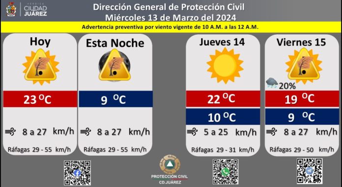 Se informa que para hoy se esperan fuertes ráfagas de viento que alcanzarán los 55 kilómetros por hora, en tanto que la velocidad del viento durante el día oscilará entre 8 a 27 kilómetros por hora.