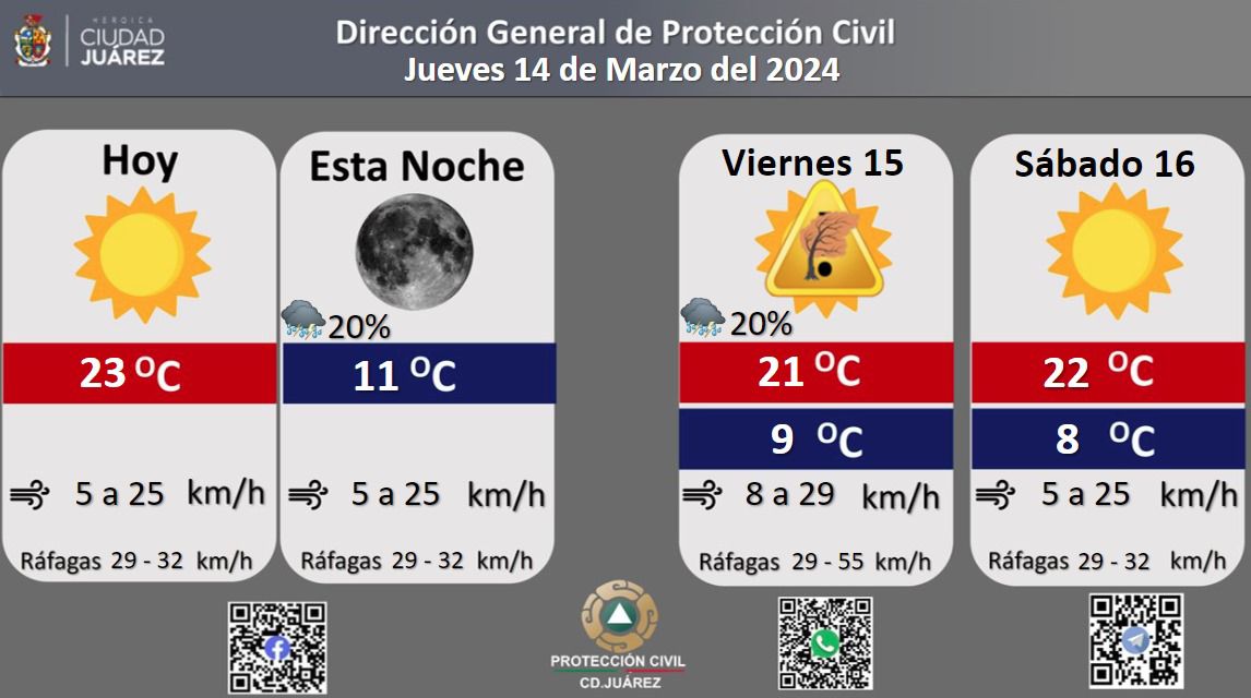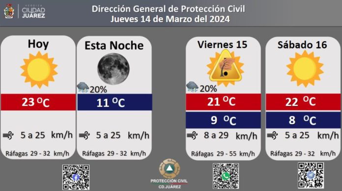 Para mañana viernes se esperan fuertes ráfagas de viento que llegarán a los 55 kilómetros por hora, además existe una probabilidad de lluvia de un 20 por ciento, la temperatura máxima se pronostica en los 21 °C, mientras que la mínima será de 9 °C, la velocidad del viento oscilará de 8 a 29 kilómetros por hora.