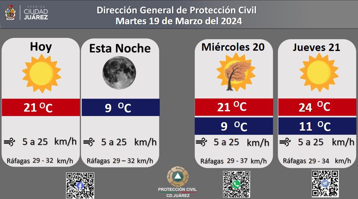 Para mañana miércoles se esperan fuertes ráfagas de viento que llegarán los 37 kilómetros por hora, la temperatura máxima se pronostica en los 21 °C, mientras que la mínima será de 9 °C, la velocidad del viento oscilará de 5 a 25 kilómetros por hora.