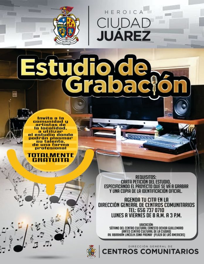 Con el objetivo de contribuir en el desarrollo de eventos culturales, educativos y artísticos, la Dirección General de Centros Comunitarios dispone de un estudio de grabación.