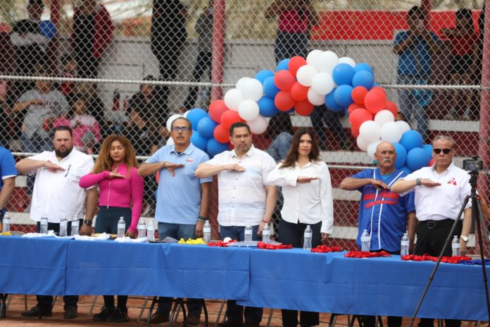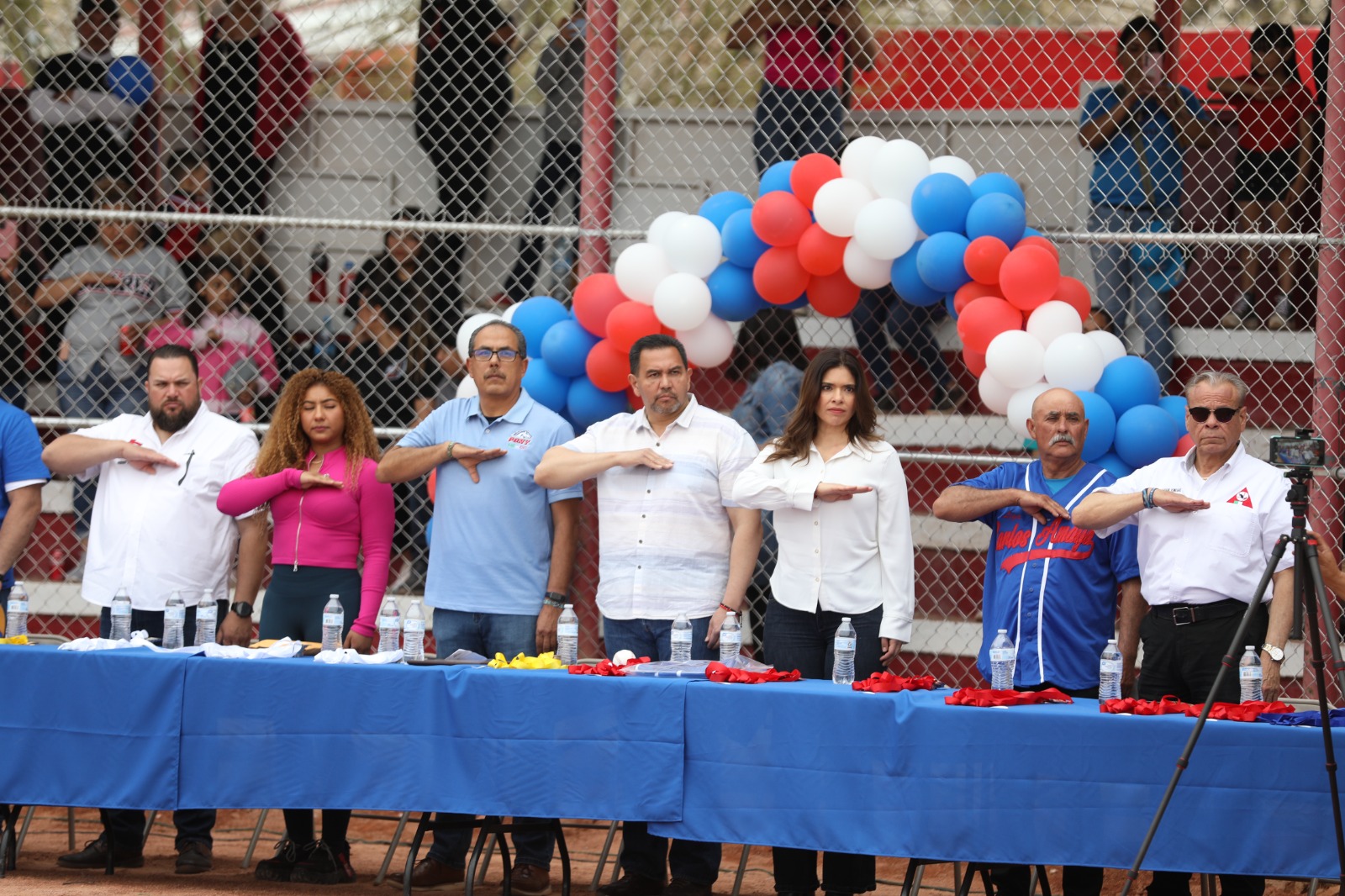 El Presidente Municipal de Ciudad Juárez, junto con su esposa, presidió la apertura de la temporada de verano de la Liga Infantil de Béisbol “Carlos Amaya” en el campo del Parque Galeana, donde más de 130 niñas, niños y adolescentes participarán en esta competencia.