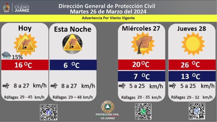 La Dirección General de Protección Civil, con base en informes del Servicio Meteorológico Nacional, pronostica fuertes ráfagas de viento que podrían alcanzar los 48 kilómetros por hora este martes, además existe una probabilidad de lluvia de un 15 por ciento.