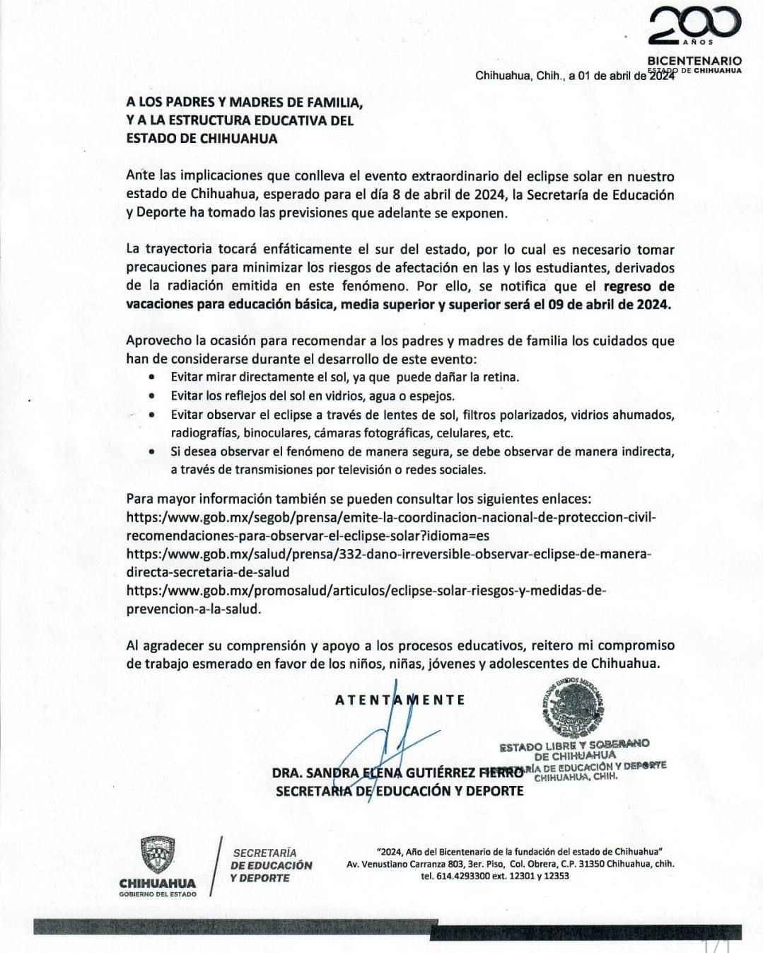 En el oficio firmado por la Dra. Sandra Elena Gutiérrez Fierro, se da a conocer que debido a “las radiaciones” que se emitirán debido al eclipse total de sol que tendrá lugar el próximo lunes 8 y que cubrirá nuestro estado, y para proteger la salud de los alumnos de todos los niveles, se decidió suspender las clases ese día y postergar el regreso hasta el martes 9.