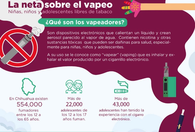 De acuerdo con la dependencia, en el estado de Chihuahua existen 554 mil fumadores entre los 12 a los 65 años; más de 22 mil adolescentes de 12 a 17 años fuman y más de 43 mil adolescentes han tenido experiencia con el cigarro electrónico.