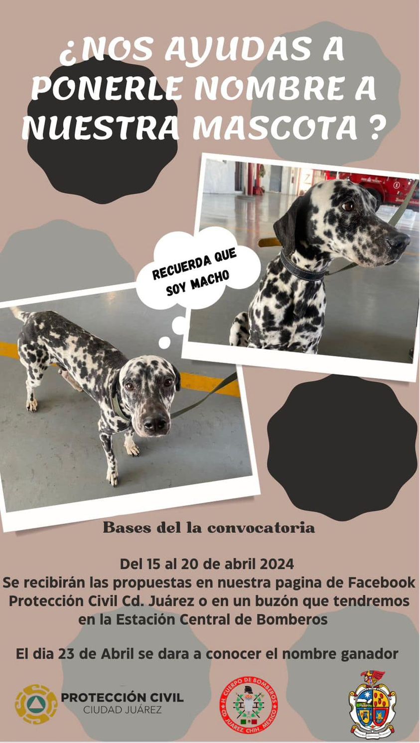 La Dirección General de Protección Civil ha lanzado una convocatoria para que la comunidad participe en la elección del nombre del más reciente miembro del Departamento de Bomberos: un valiente y leal perro dálmata, de 2 años de edad, gentilmente donado por la Dirección de Ecología a esta destacada dependencia.