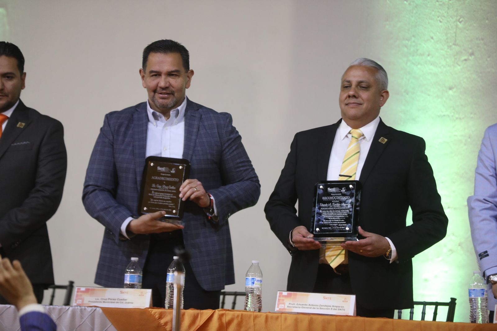 Eduardo Antonio Zendejas Amparán, secretario general de la Sección Octava del SNTE, felicitó a las educadoras y agradeció al Presidente Municipal su compromiso por Juárez a través de la educación pública.