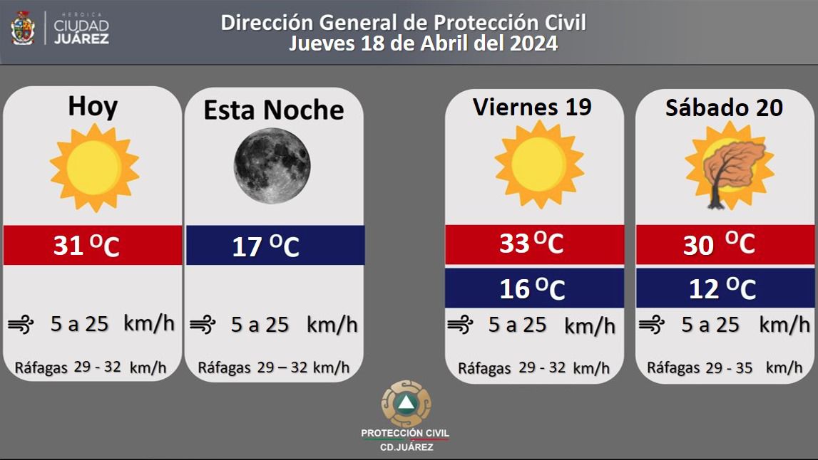 Para mañana viernes se esperan fuertes ráfagas de viento que llegarán a los 32 kilómetros por hora, la temperatura máxima se pronostica en los 33 °C, mientras que la mínima será de 16 °C, la velocidad del viento oscilará de 5 a 25 kilómetros por hora.