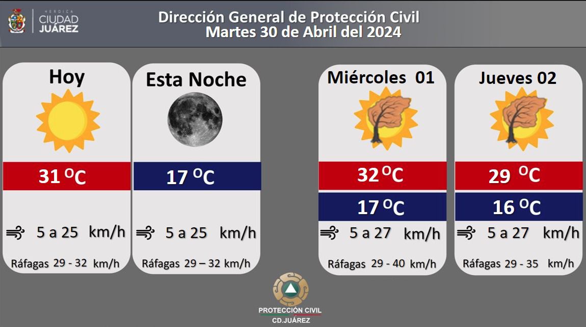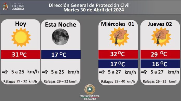Para mañana se pronostica una temperatura máxima de 32 grados Centígrados y mínima de 17. Los vientos prevalecerán de 5 a 27 kilómetros por hora y las ráfagas alcanzarán hasta los 40 kilómetros por hora.