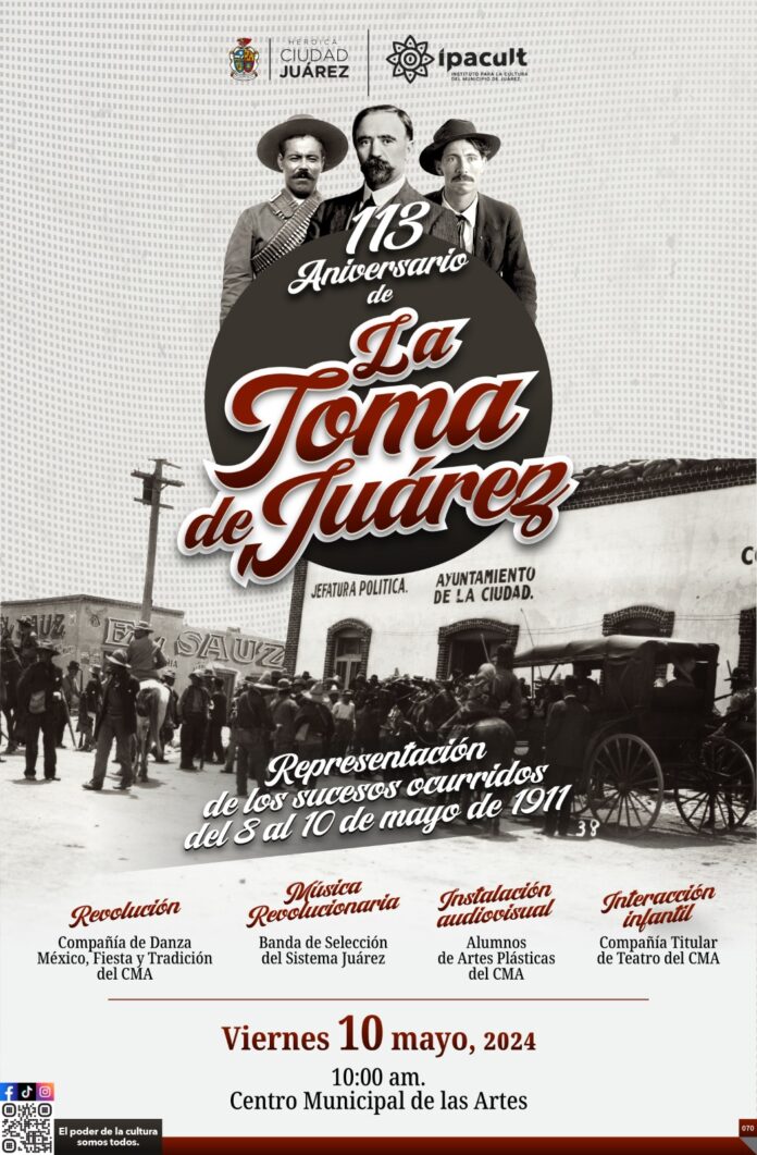Con música, danza y teatro, así se llevará a cabo la conmemoración del 113 aniversario de “La toma de Ciudad Juárez”, por parte del Instituto para la Cultura. En esta ocasión será frente al edificio del Centro Municipal de las Artes (CMA).