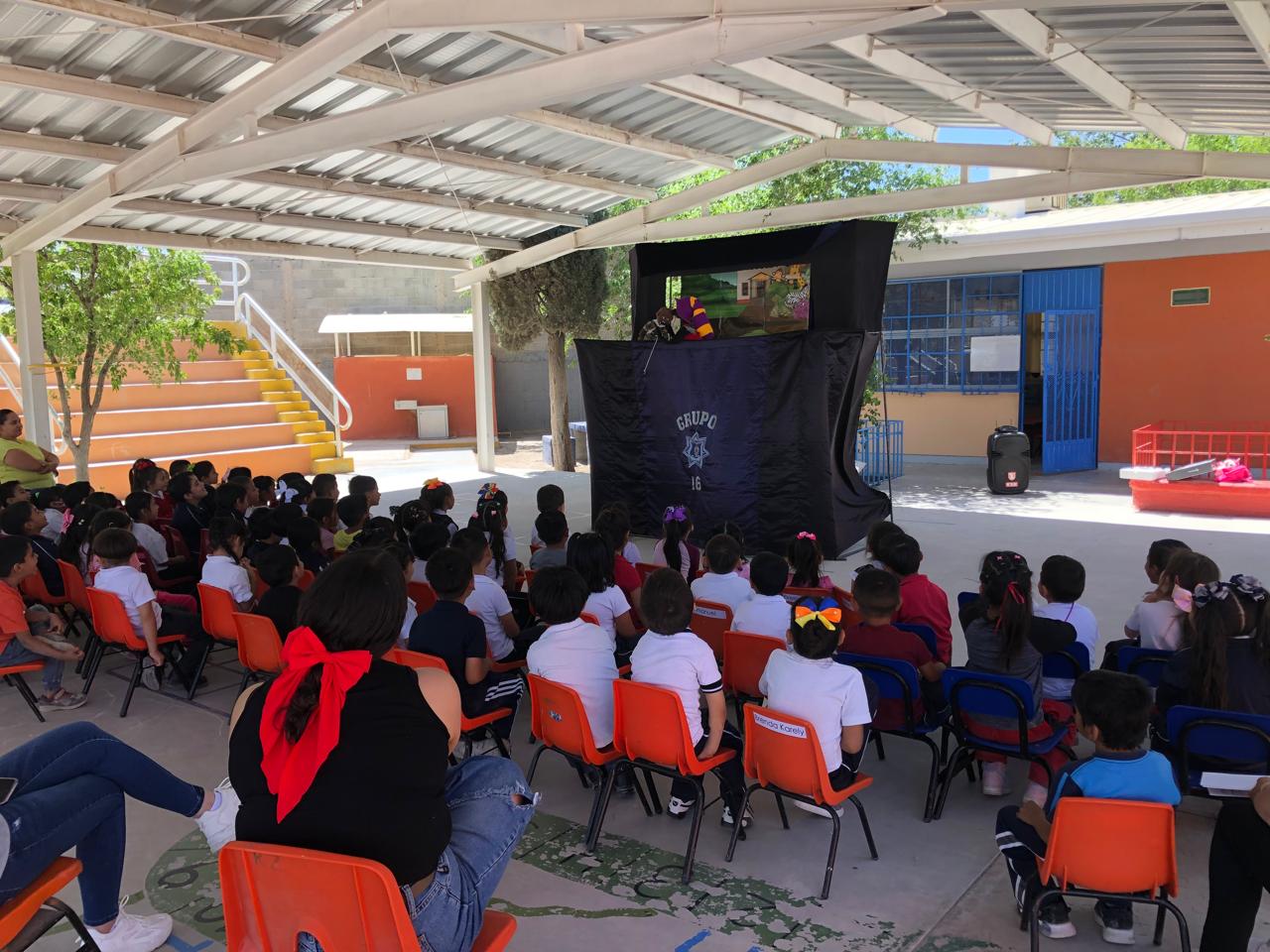 De una manera divertida, los agentes preventivos lograron captar la atención de los niños y niñas que asisten al Jardín de Niños “Rosaura Zapata”, ubicado en la colonia Moderna, impartiendo temas en cuestión de seguridad de acuerdo con su edad, por medio de una función de teatro.