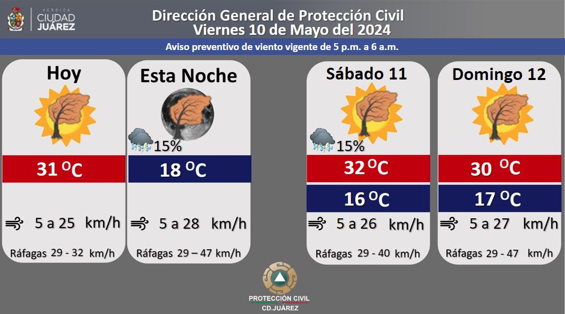 La Dirección General de Protección Civil del Municipio informó que estas ráfagas de viento comenzarán a aumentar gradualmente después de las 5:00 de la tarde y disminuirán paulatinamente después de las 3:00 de la mañana, mientras que la posibilidad de lluvia es del 15 por ciento y en caso de registrarse, se prevé en la tarde y noche.