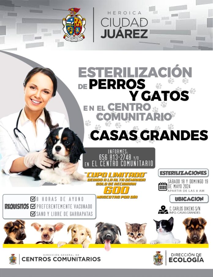 La Dirección General de Centros Comunitarios, en coordinación con la Dirección de Ecología, llevarán a cabo una jornada de esterilización de perros y gatos el próximo fin de semana.