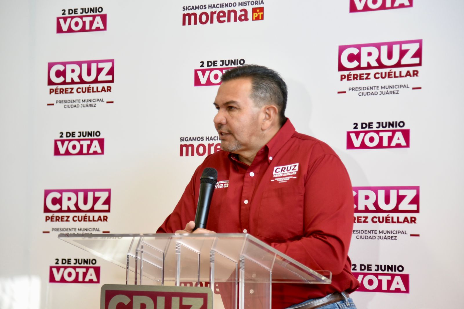 Ciudad Juárez, Chih.- El candidato a la alcaldía por la coalición “Sigamos Haciendo Historia por Chihuahua”, Cruz Pérez Cuéllar, dijo en rueda de prensa que más allá de que las encuestas lo favorecen, es importante que la ciudadanía salga a votar el próximo 2 de junio.