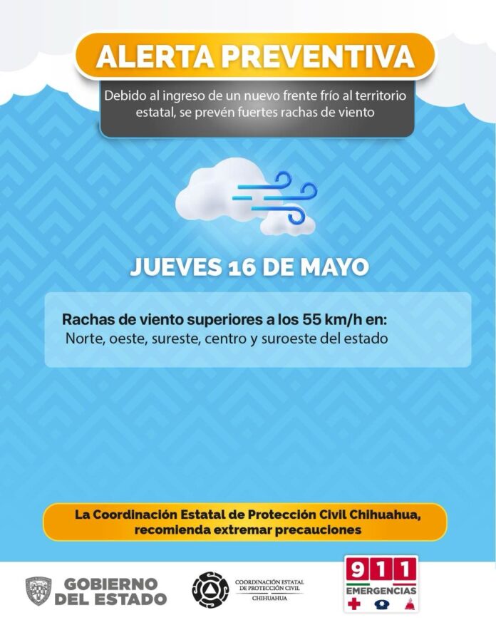 Durante los días martes y miércoles, las rachas alcanzarán velocidades de hasta 55 kilómetros por hora (km/h) en Ascensión, Guadalupe, Práxedis G. Guerrero, Ahumada, Janos, San Francisco de Borja, Cusihuiriachi, Cuauhtémoc, Juárez, Riva Palacio, Santa Isabel, Chihuahua, Dr. Belisario Domínguez, Satevó, Rosario y Parral.