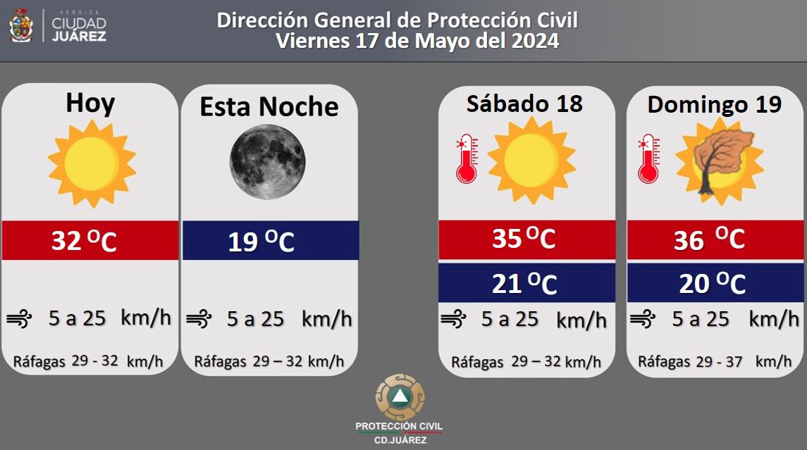 Para hoy la velocidad del viento oscilará entre 5 y 25 kilómetros por hora con la posibilidad de ráfagas de viento con una velocidad entre 29 y 32 kilómetros; en tanto que la temperatura mínima se pronostica en 19 °C.