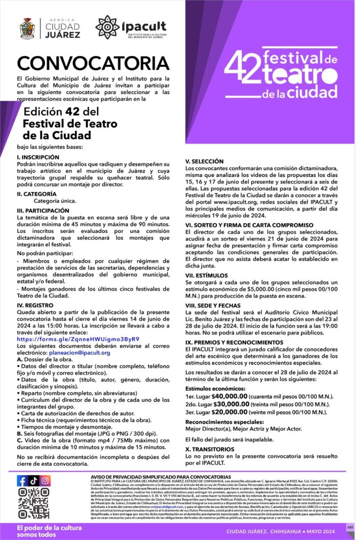 El Instituto para la Cultura del Municipio de Juárez (IPACULT) te invita a participar en uno de los festivales que fomenta y premia el trabajo de las y los artistas en la disciplina teatral, sumando experiencia para su desarrollo profesional.