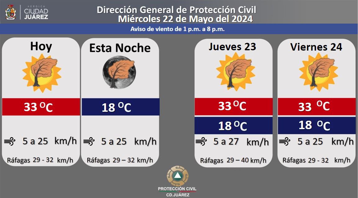 La Dirección General de Protección Civil informó que para este miércoles 22 de mayo la temperatura máxima estará en aproximadamente 33 grados Centígrados, mientras que la mínima será de 18 grados.