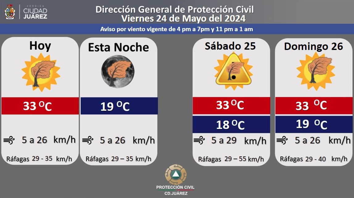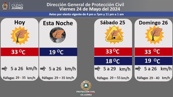 La velocidad del viento oscilará entre 5 y 26 kilómetros por hora con posibilidades de ráfagas de viento con una fuerza entre 29 y 35 kilómetros por hora, registrándose de ligero a moderado entre las 16:00 y 19:00 horas y de las 23:00 a la 01:00 horas.