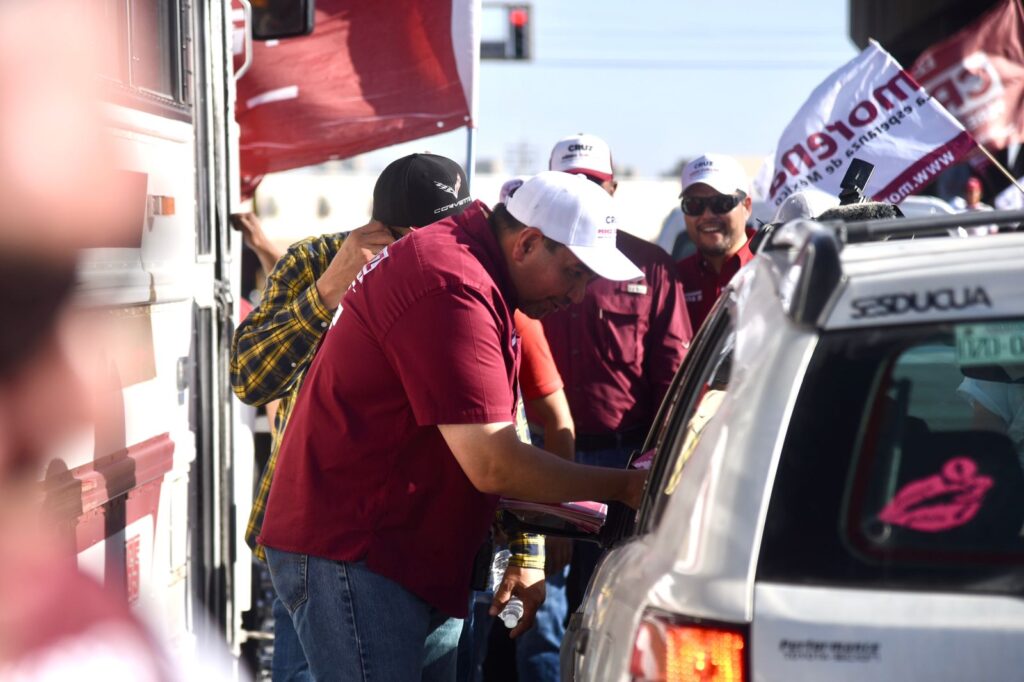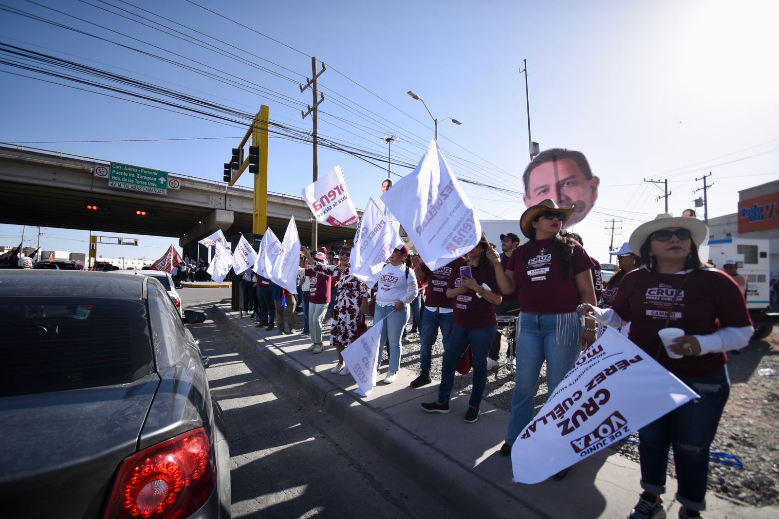 Ciudad Juárez, Chih.- Cruz Pérez Cuéllar, candidato a la alcaldía de Ciudad Juárez por la coalición “Sigamos Haciendo Historia en Chihuahua”, llevó a cabo una actividad de contacto directo con la ciudadanía al saludar y platicar con conductores y peatones en un crucero vial.