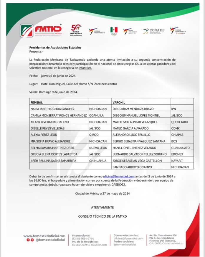 Los atletas con ranking cinta negra G5 deberán acudir al campamento que se realizará en la ciudad de Zacatecas del 6 al 9 de junio.