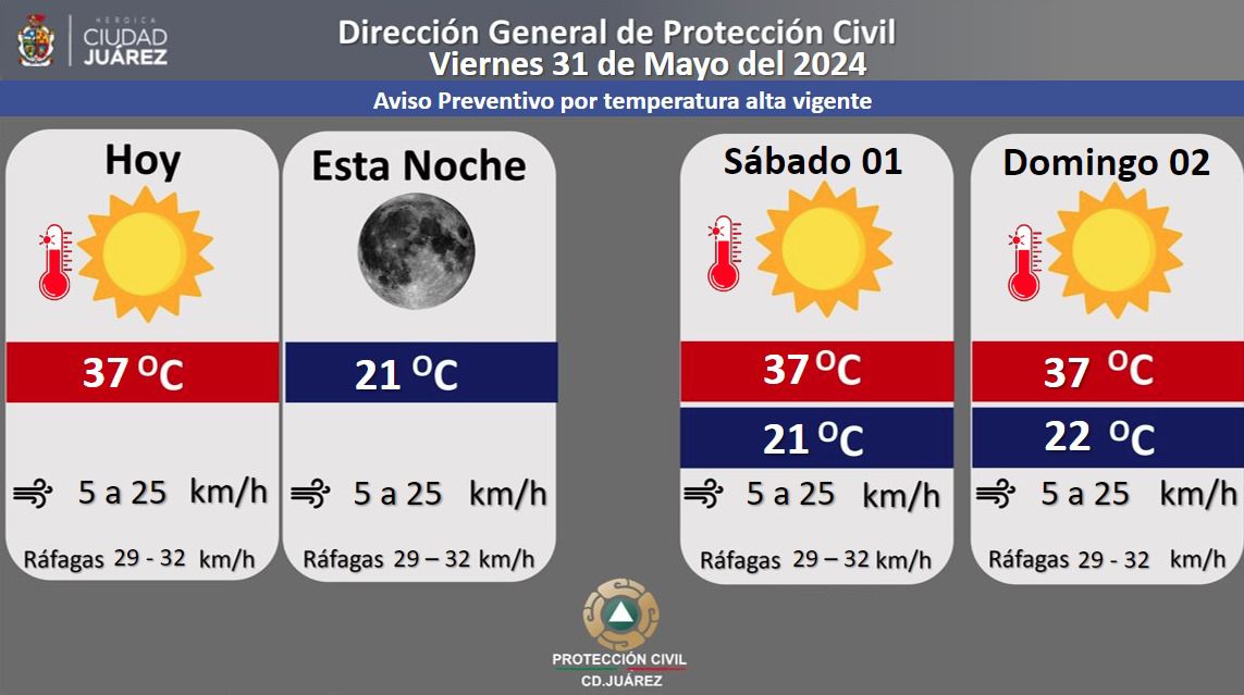 La Dirección General de Protección Civil, con base en informes del Servicio Meteorológico Nacional, pronostica un viernes mayormente soleado con una temperatura máxima de 37 grados Celsius, mientras que la mínima será de 21 °C para esta noche.