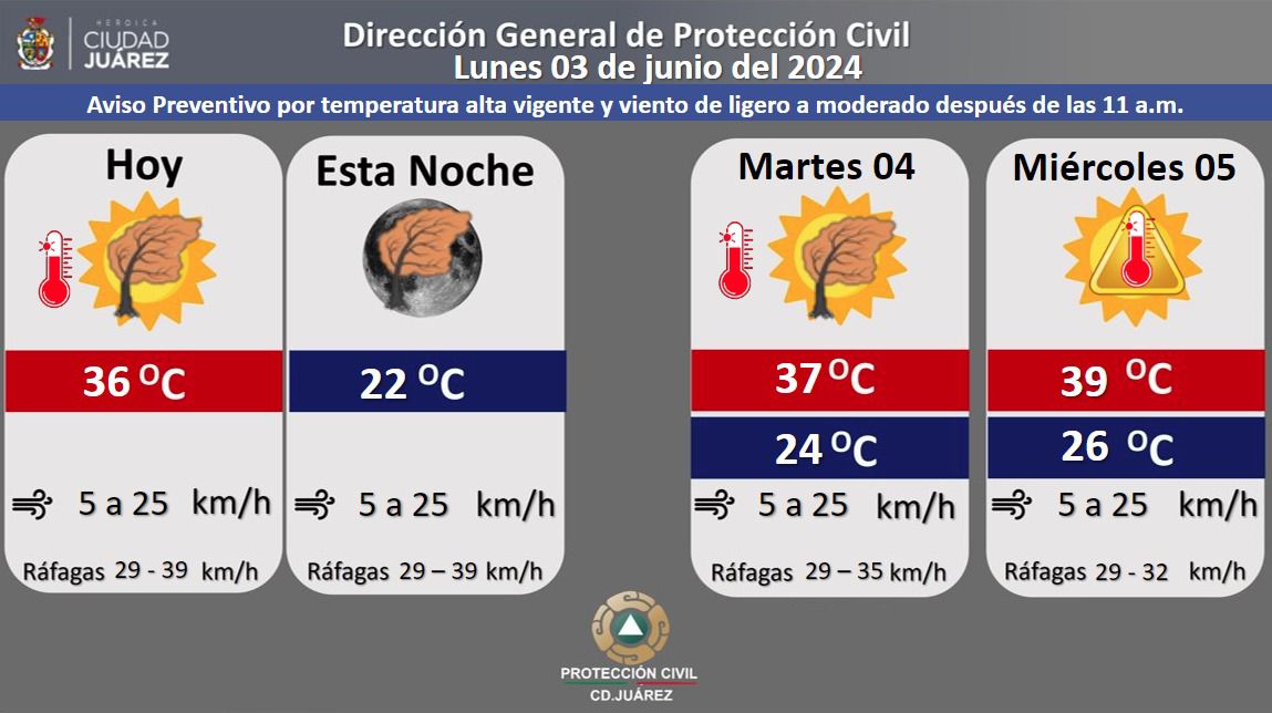 La Dirección General de Protección Civil, con base en informes del Servicio Meteorológico Nacional, pronostica un lunes mayormente soleado con una temperatura máxima de 36 grados Celsius, mientras que la mínima será de 22 °C para esta noche.