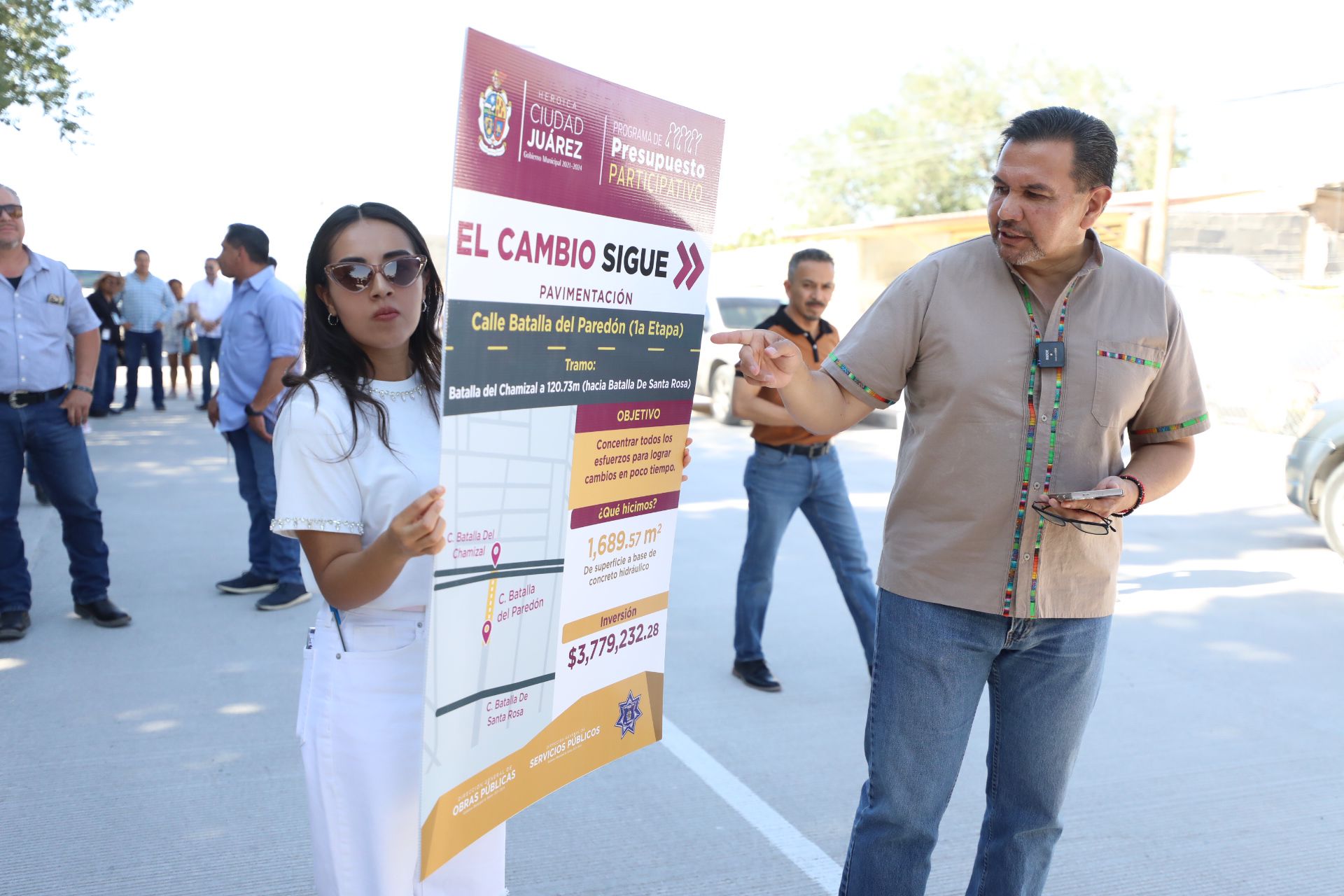 Los trabajos constaron de pavimentación en 1,689.52 metros cuadrados de superficie a base de concreto hidráulico, en el tramo que corresponde de la calle Batalla del Chamizal, a 120 metros hacia la calle Batalla de Santa Rosa, bajo una inversión de $3,779,232.28.