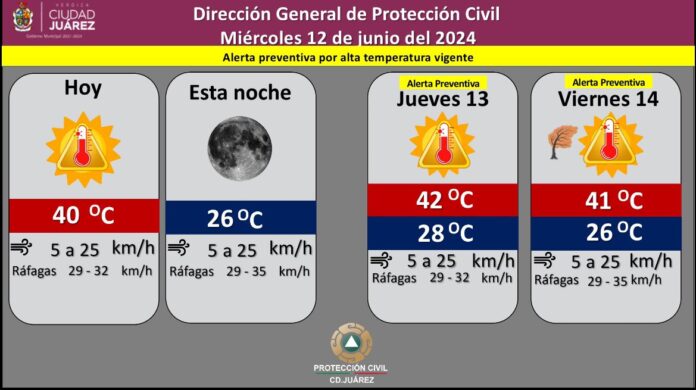 La Dirección General de Protección Civil, con base en informes del Servicio Meteorológico Nacional, pronostica un miércoles soleado con una temperatura máxima de 40 grados Celsius, mientras que la mínima será de 26 °C para esta noche.