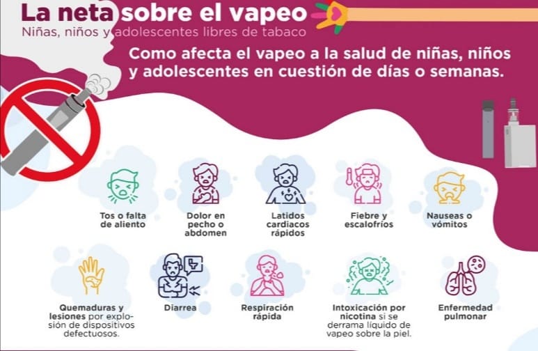 Indicó que muchos padres de familia desconocen sobre el tema, por lo que deben saber que los vapeadores afectan a los pequeños provocándoles tos o falta de aliento, dolor en el pecho o abdomen, latidos cardiacos rápidos, fiebre y escalofríos, nauseas o vómito, quemaduras y lesiones por explosión de dispositivos defectuosos, diarrea, respiración rápida, enfermedad pulmonar e intoxicación por nicotina.