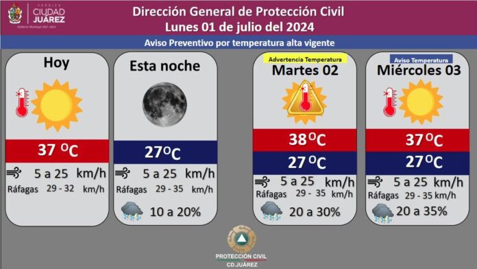 La Dirección General de Protección Civil, con base en informes del Servicio Meteorológico Nacional, pronostica un 20 por ciento de probabilidad de lluvias asiladas para este lunes, con una temperatura máxima de 37 grados Celsius, mientras que la mínima será de 27 °C para esta noche.