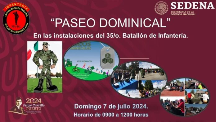 Nuevo Casas Grandes, Chih., a 02 de julio de 2024.- La Secretaría de la Defensa Nacional, a través de la Comandancia del 35/o. Batallón de Infantería, invita a la sociedad en general a participar en el Paseo Dominical que se llevará a cabo el día 07 del mes en curso, en las instalaciones del 35/o. Batallón de Infantería.