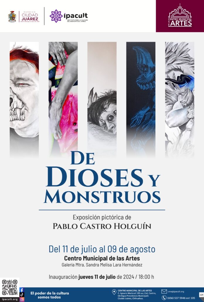 El Instituto para la Cultura del Municipio de Juárez (IPACULT) invita a toda la ciudadanía a la exposición pictórica “De Dioses y Monstruos”, del artista plástico Pablo Castro Holguín, la cual será exhibida en la galería “Melisa Lara Hernández” del Centro Municipal de las Artes (CMA).