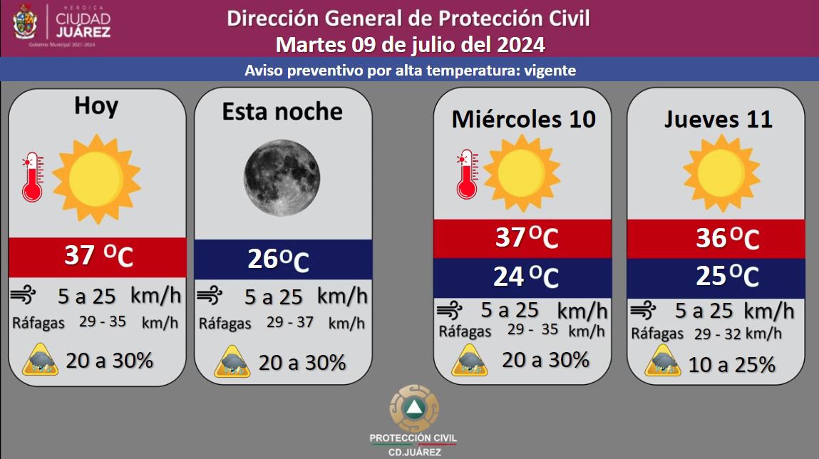 La Dirección General de Protección Civil, con base en informes del Servicio Meteorológico Nacional, pronostica un 30 por ciento de probabilidad de lluvia para este martes, con una temperatura máxima de 37 grados Celsius, mientras que la mínima será de 26 °C para esta noche.