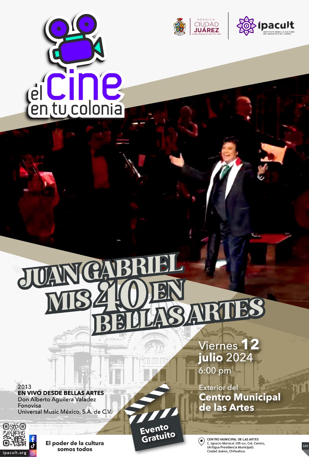Como parte del programa “El cine en tu colonia”, el Instituto para la Cultura del Municipio de Juárez (IPACULT), encabezado por Myrna Judith Barajas Martínez, invita a la ciudadanía a disfrutar de la exhibición del icónico concierto “Juan Gabriel: Mis 40 en Bellas Artes”.
