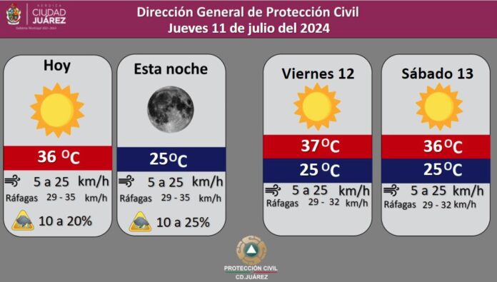 La Dirección General de Protección Civil, con base en informes del Servicio Meteorológico Nacional, pronostica un 25 por ciento de probabilidad de lluvias aisladas para este jueves, con una temperatura máxima de 36 grados Celsius, mientras que la mínima será de 25 °C para esta noche.