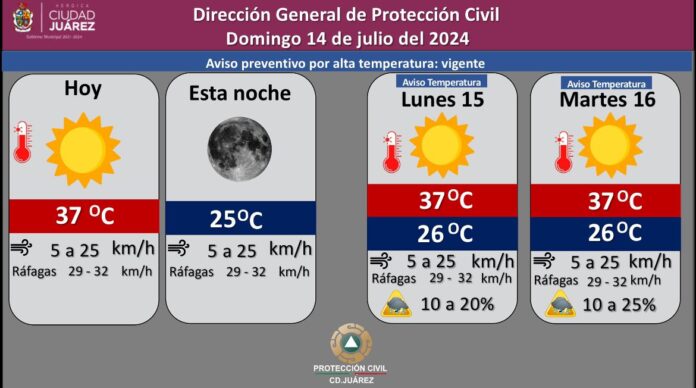 La Dirección General de Protección Civil, con base en informes del Servicio Meteorológico Nacional, pronostica un domingo soleado, con una temperatura máxima de 37 grados Celsius, mientras que la mínima será de 25 °C para esta noche.
