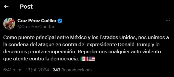 El Presidente Municipal, Cruz Pérez Cuéllar, lamentó el ataque que sufrió esta tarde el ex presidente de Estados Unidos, Donald Trump, tras un tiroteo durante un mitin político en Butler, Pennsylvania.