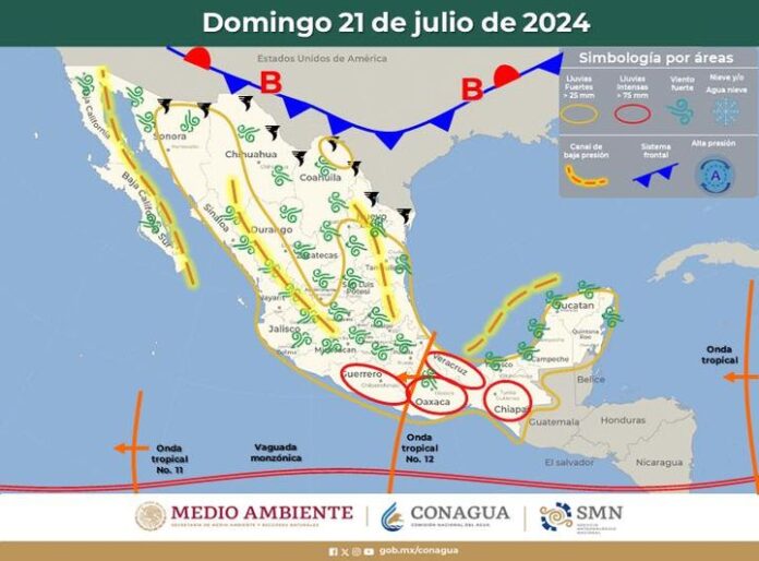 El Sistema Meteorológico Nacional (SMN) dio a conocer que para este domingo 21 de julio, el monzón mexicano sobre el noroeste del territorio nacional, interaccionará con divergencia en altura, generando lluvias fuertes a muy fuertes acompañadas de descargas eléctricas, rachas de viento y posible caída de granizo en entidades como Chihuahua.