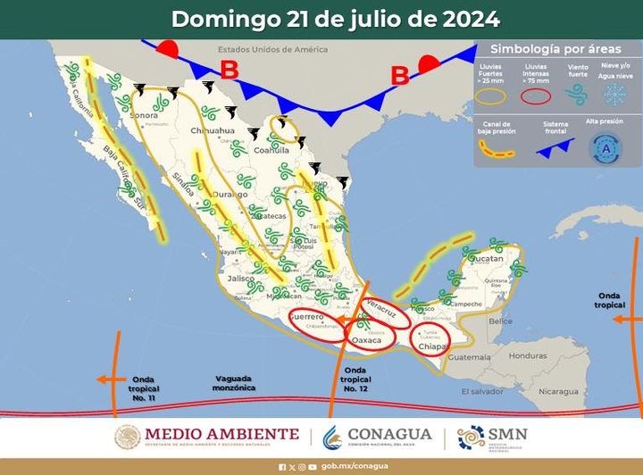 Al respecto, se esperan lluvias fuertes con puntuales muy fuertes (50 a 75 mm) en: Sonora, Chihuahua, Michoacán, Estado de México, Ciudad de México, Morelos, Puebla y Tabasco.