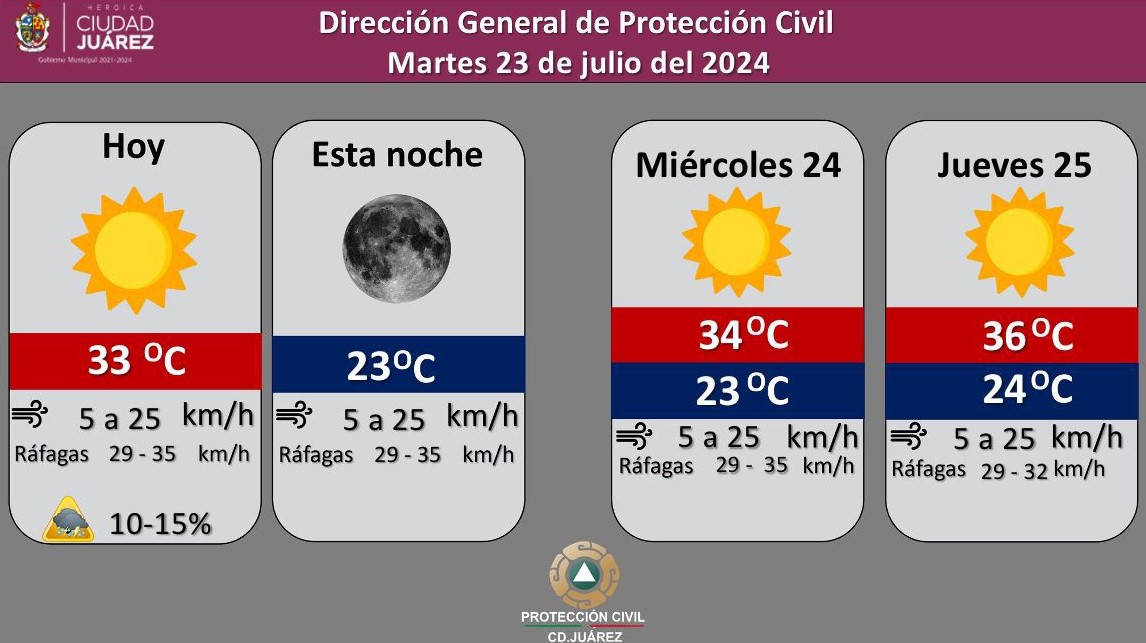 La Dirección General de Protección Civil, con base en informes del Servicio Meteorológico Nacional, pronostica un 10 a un 15 por ciento de probabilidad de lluvia para este martes, con una temperatura máxima de 33 grados Celsius, mientras que la mínima será de 23 °C para esta noche.