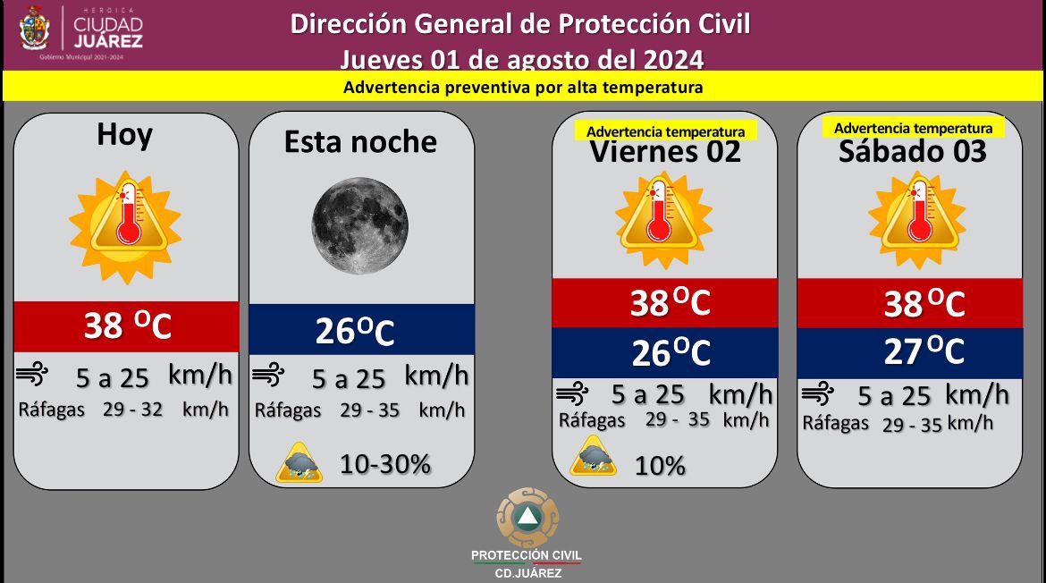 La Dirección de Protección Civil informa que para hoy jueves, se espera un día parcialmente nublado, con temperatura máxima de 38 grados Centígrados y mínima de 26 grados.