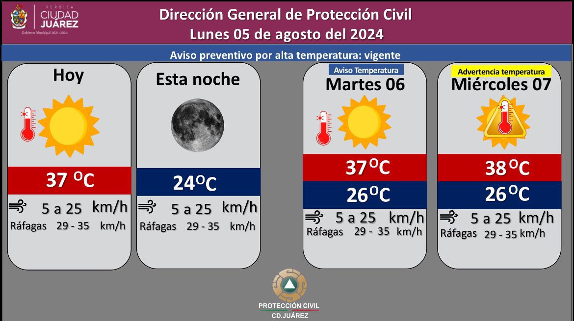 La Dirección de Protección Civil informa que para hoy lunes se espera un día parcialmente nublado, con temperatura máxima de 37 grados Centígrados y mínima de 24 grados.