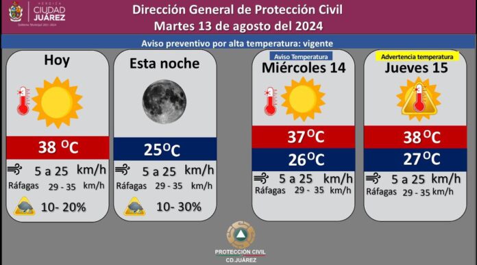 La Dirección de Protección Civil informa que para hoy martes se espera un día parcialmente nublado, con temperatura máxima de 38 grados Centígrados y mínima de 25 grados.