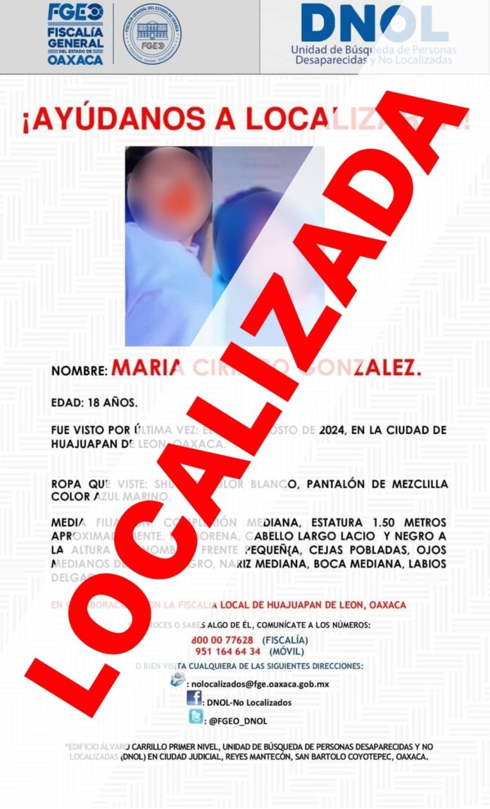 En un operativo conjunto entre la Fiscalía de Distrito Zona Noroeste y la Fiscalía del Estado de Oaxaca, se logró ubicar a María Ciriaco González, una joven de 18 años que había sido reportada como desaparecida en el estado de Oaxaca.