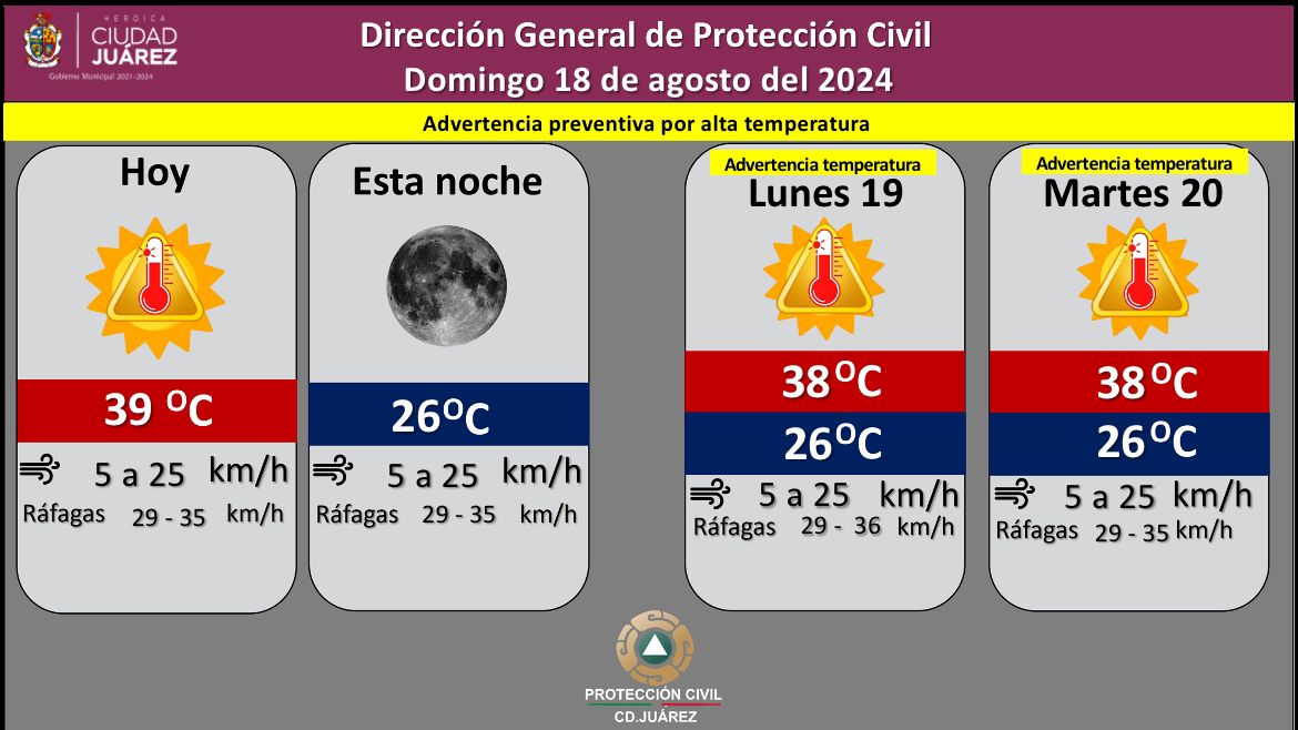 La Dirección General de Protección Civil informó que el viento oscilará entre 5 y 25 kilómetros por hora con la posibilidad de ráfagas de viento con una velocidad entre 29 y 35 kilómetros por hora, mientras que la probabilidad de lluvia y tormentas eléctricas es menor al 10 por ciento.