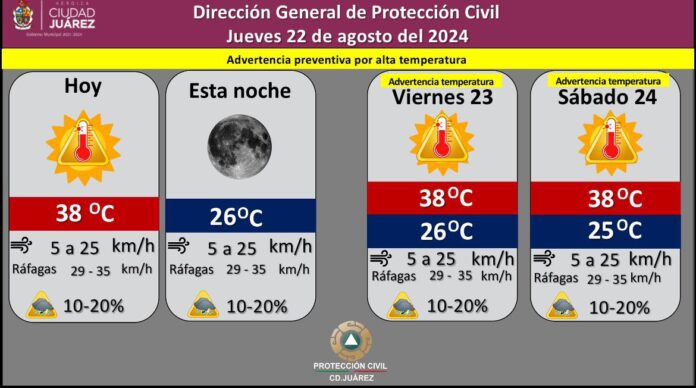 La Dirección General de Protección Civil informa que para hoy jueves se espera un cielo despejado, con temperatura máxima de 38 grados Centígrados y mínima de 26 grados.